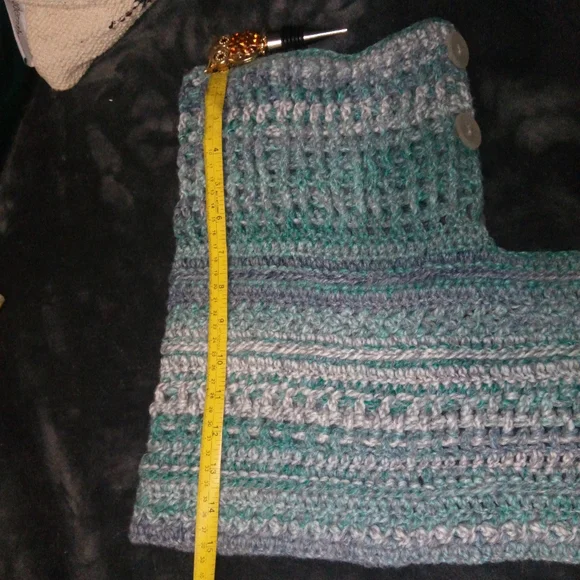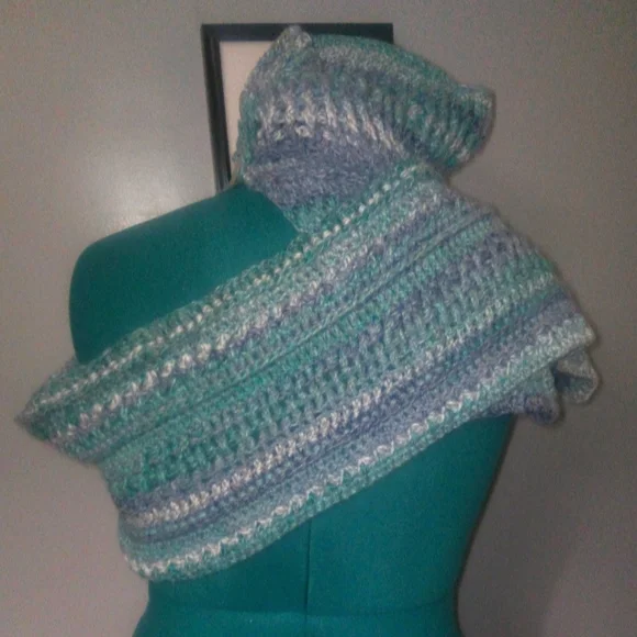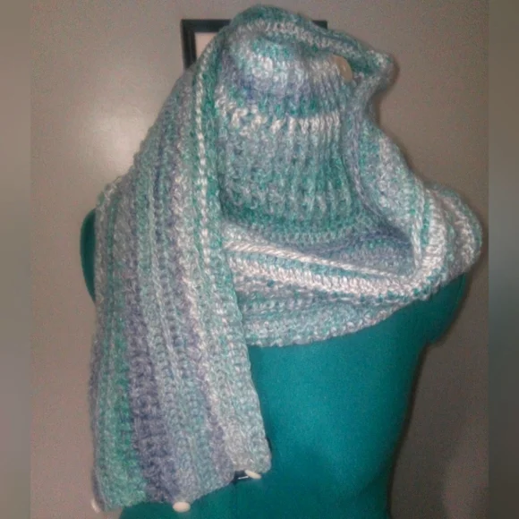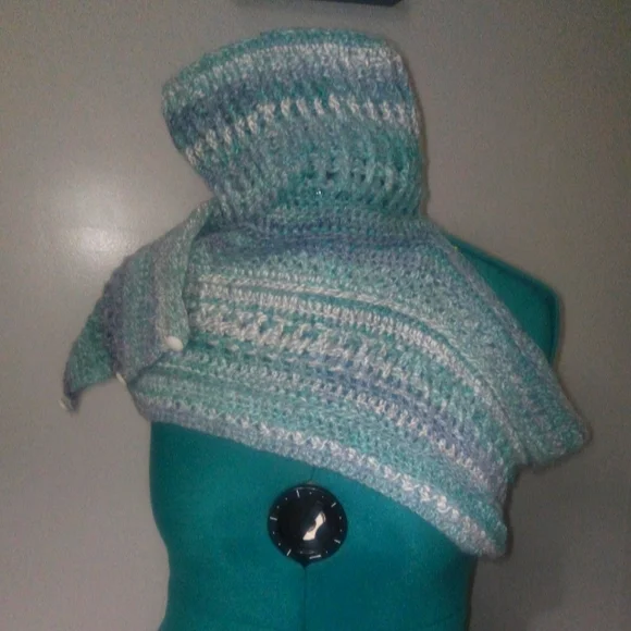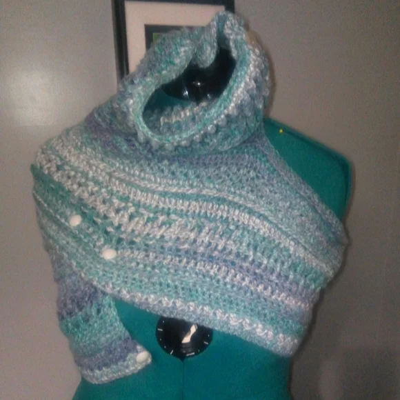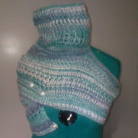 Handcrafted Crochet Textured Multiwear ScarfMedium weight & made with machine washable acrylic yarn, this beautiful, stretchy garment comes in shades of blue, green, and white. Especially designed for warmth, it has a 3 button closure at the tightly woven neck and 3 button closure for the scarf portion.Multi-functional - Wear it wide across the body or wrap both parts around your neck for extra warmth. Looks great over a cardigan or jacket! Measurements in photos. New to ?Use referral code CLARITYFINDS and get $10. * Striped * Textured * Cool Weather Katniss * Boho *